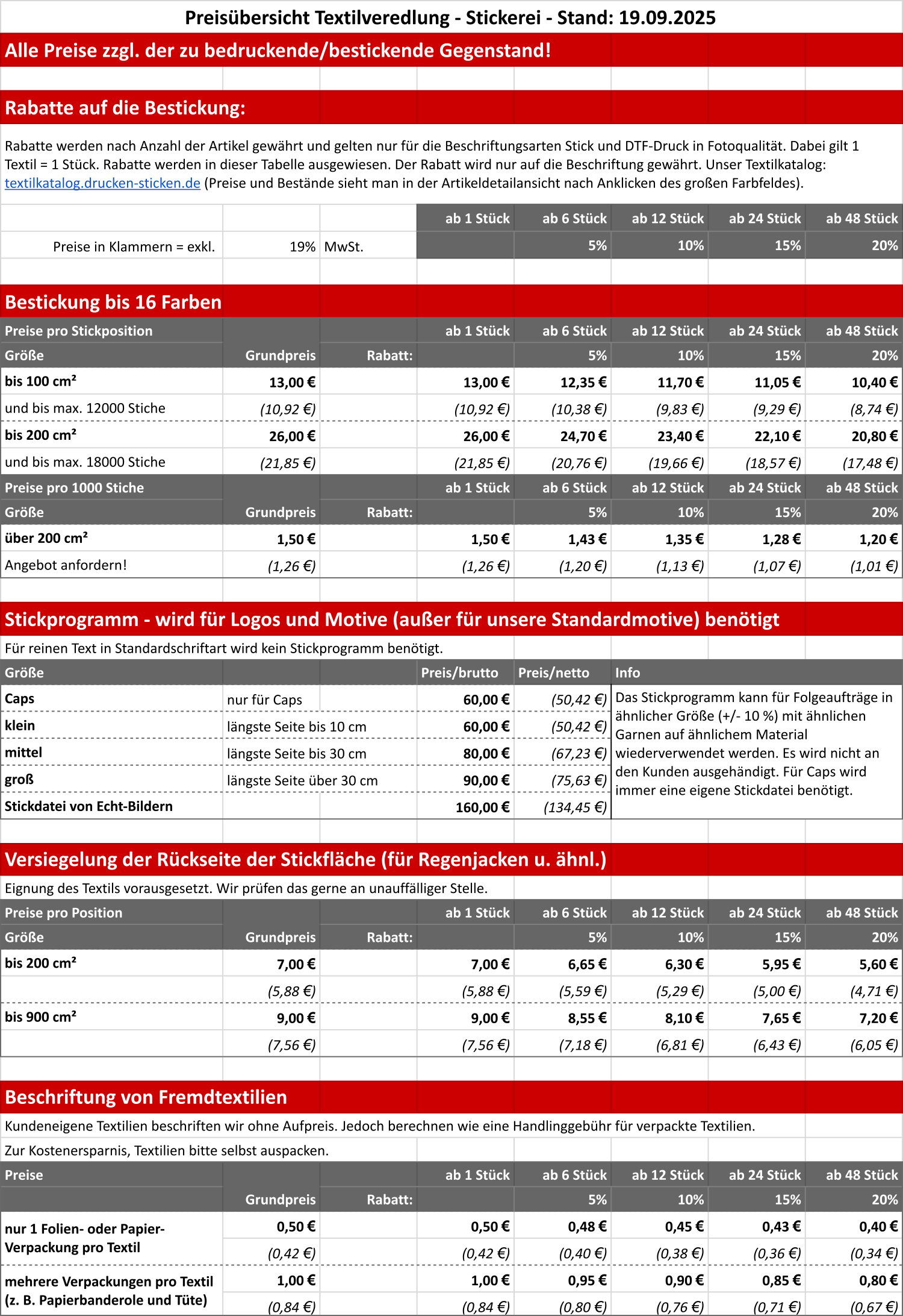 Hier finden Sie unsere Preise für Standard-Stickereien. Aufwendige Motive, große Motive und Sonderartikel wie Patches/Aufnäher bieten wir Ihnen gerne separat an.